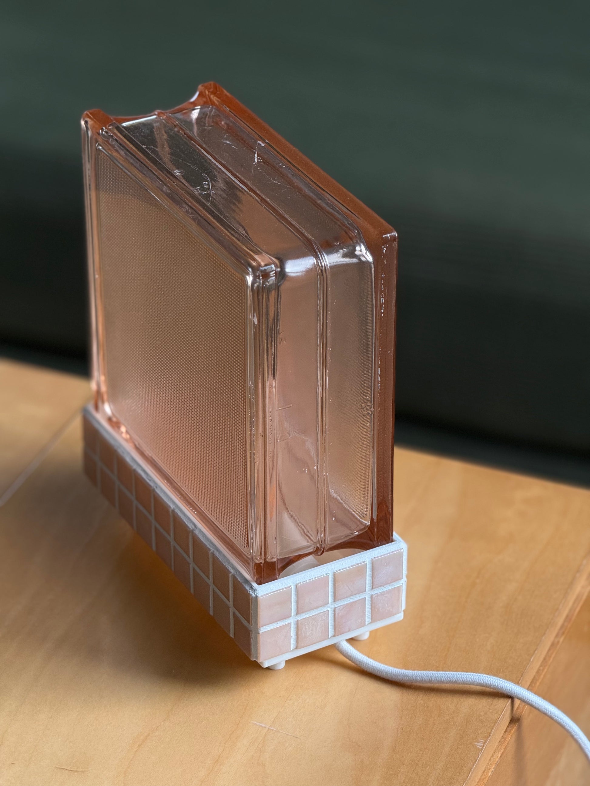 Die fein strukturierte Glasoberfläche streut das Licht gleichmäßig und erzeugt ein ruhiges, warmes Leuchten. Der Glasstein ruht auf einem präzise gefertigten 3D-gedruckten Fuß, der mit tiefblauen Mosaikfliesen verkleidet ist. Die klare Farbigkeit des Sockels bildet einen bewussten Kontrast zur Transparenz des Glases und verleiht der Lampe eine grafische Präsenz.