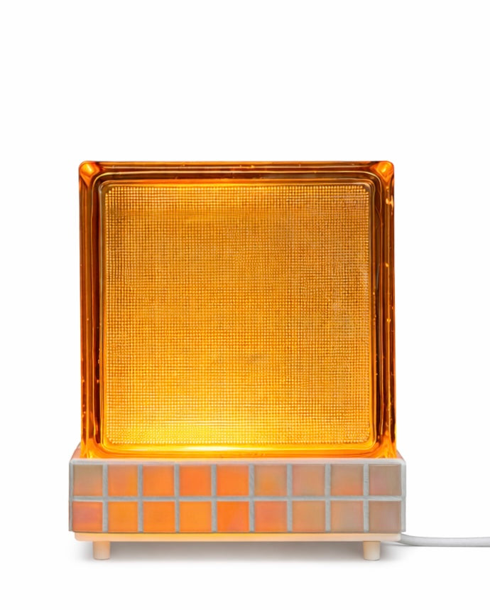Die Leuchte wird im 3D-Druckverfahren aus biobasiertem Material gefertigt und mit wiederverwendeten Glasbausteinen kombiniert. Keramik-Mosaiksteine ergänzen die Oberfläche und setzen gezielte, handwerkliche Akzente.